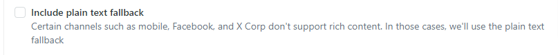 Once the message has been entered, check the box for 'Include plain text fallback'. This allows the message to be used on a cell phone.