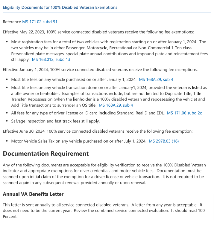 It is against federal law for non-government individuals or entities to make photocopies or images from DOD issued ID cards. Dealers will not be able to make photocopies of DOD ID cards to substantiate the 100% Disabled Veteran exemptions. The buyer will need to provide a different eligibility document such as a Veteran's Administration (VA) initial decision/award letter or the annual letter disabled veterans receive from the VA.
