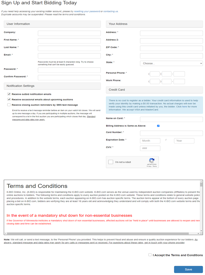 - Card information will need to be re-entered each time bidder receives error when creating account
